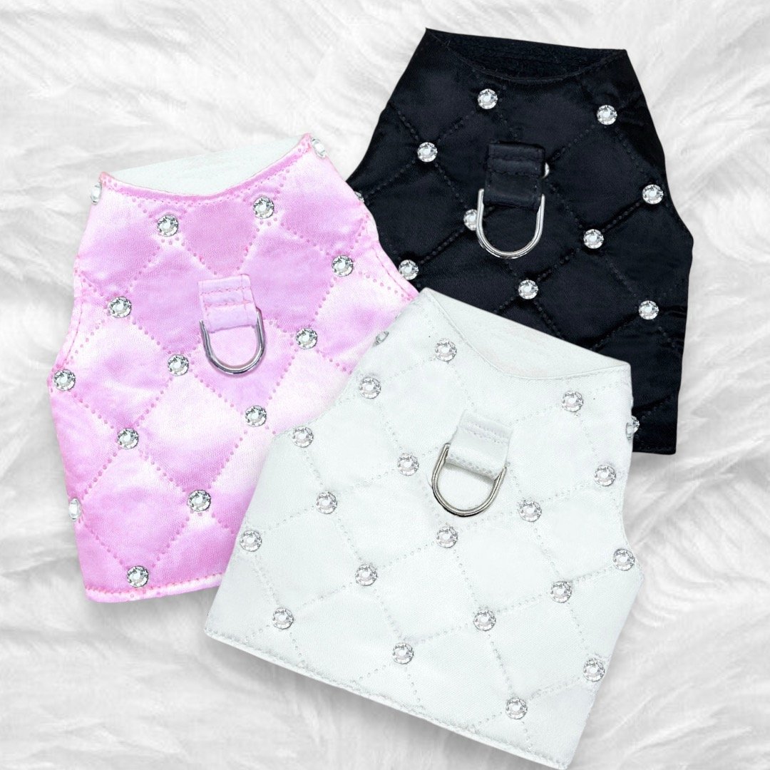 Elevate your pet's wardrobe with the stunning Glamour Baby Dog Harness by Hello Doggie! Crafted from luxurious diamond quilted fabric and lined with soft microsuede, it ensures that your furry friend feels as fabulous as they look. What truly makes this harness a standout piece is the exquisite hand-placed Swarovski crystals that adorn it, adding a dazzling touch of glamour that sets your pooch apart from the pack. This versatile harness can be worn alone or paired with our fabulous selection of tees and sweaters, offering endless mix-and-match possibilities to create the perfect ensemble for any occasion.The Glamour Baby Collection is a true masterpiece of elegance and functionality, designed for the pooch with impeccable taste for fashion. Spot Clean Only. Limited Edition Sizes XS - LG MSRP $106.00 *Harnesses are handmade and sizes may vary slightly. Made in USA.