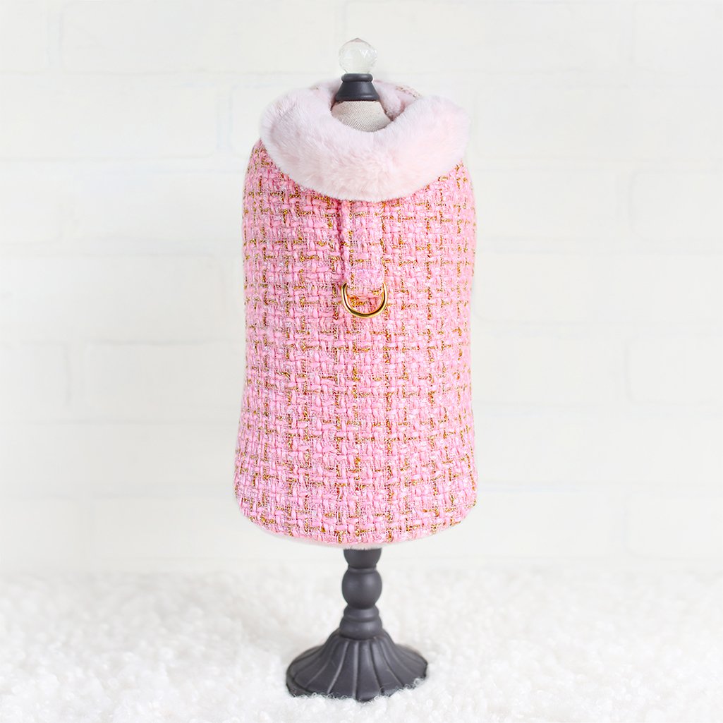 Your precious pooch will look regal in the Chantel Tweed Dog Coat by Hello Doggie. Our new coat collection was released just in time for the fall/winter season. When designing this coat we had the pooch in mind, our fur babies get cold too while they're out on the town for holiday shopping or a walk in the park. The coats are made from a beautiful soft tweed fabric and are lined with faux fur for a timeless design  and to keep out that extra chill. These coats are perfect to pair up with your favorite Hello Doggie sweater, featuring adjustable velcro straps for a perfect fit when adding layers. It is easy to care for, delicate wash with no softener or bleach and air dry. Our coats are fashionable and most importantly comfortable to wear. Each Coat has a matching harness, sold separately. Limited Edition MSRP $84.00 * Coats are handmade sizes may vary slightly. Made in USA.