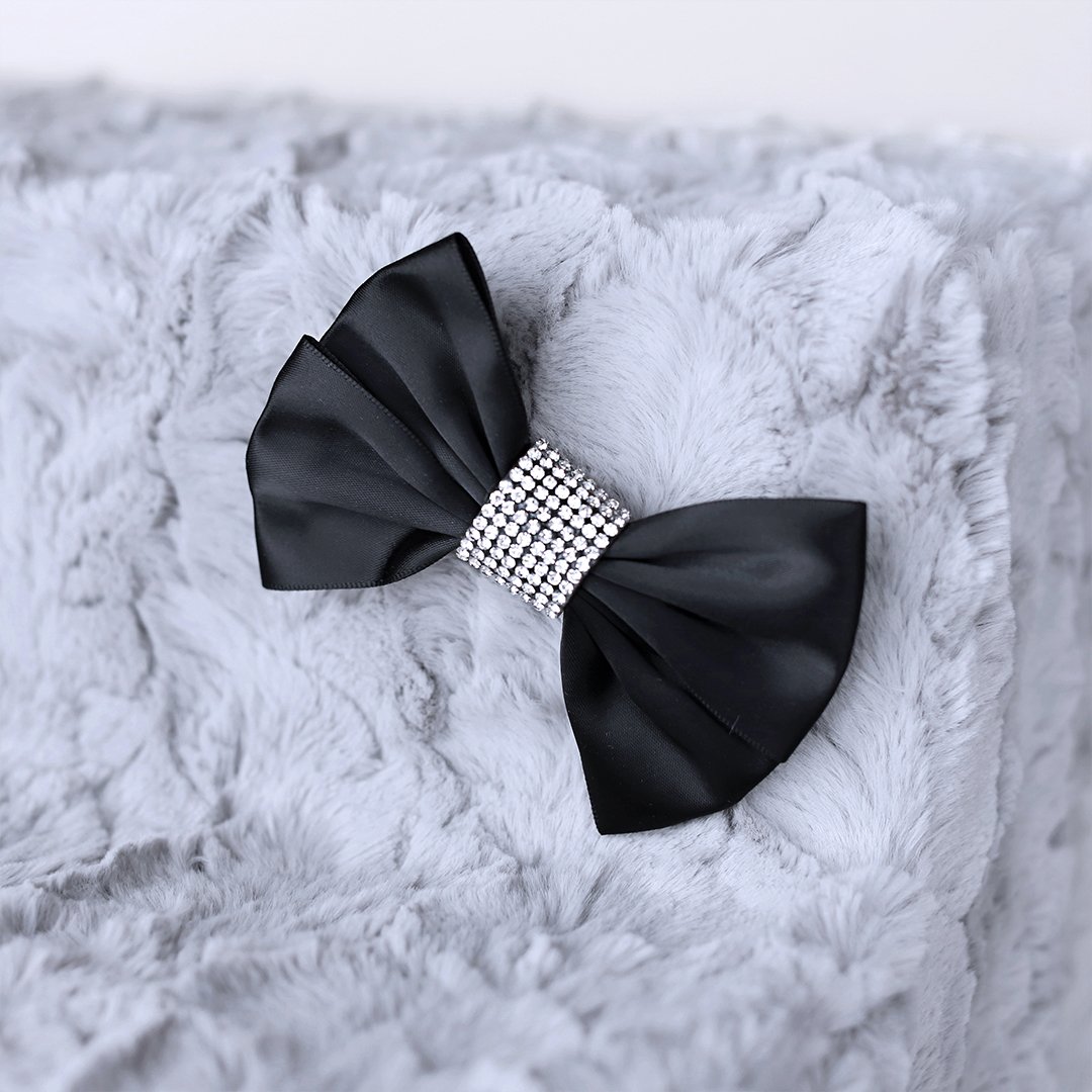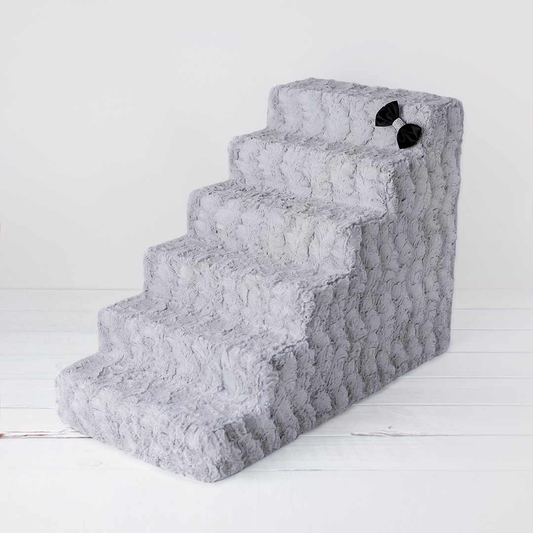 Luxury Pet Stairs handmade by Hello Doggie, covered in soft and silky luxurious fabric with a removable satin crystal bow to add a royalty feel to your home! Perfect to help your pet with a boost around the house for high couches and beds for safety and comfort to spend more time with Mommy and Daddy! High-density foam provides the perfect balance of stability and support. With a removable covered zipped up to perfection, these pet stairs can be washed and re-zipped back for a nice clean look every time! Gentle Wash, Tumble Dry low. Approximate Measurements: 4-Step - 22 1/4" L x 17 7/8" W x 16" H 6-Step - 33" L x 17" W x 24 1/4" H Each individual step measures 4" high and 5 3/4" deep MSRP - 4 Step $338   |   6 Step $480.00 * Stairs are handmade, sizes may vary slightly. Made in USA.