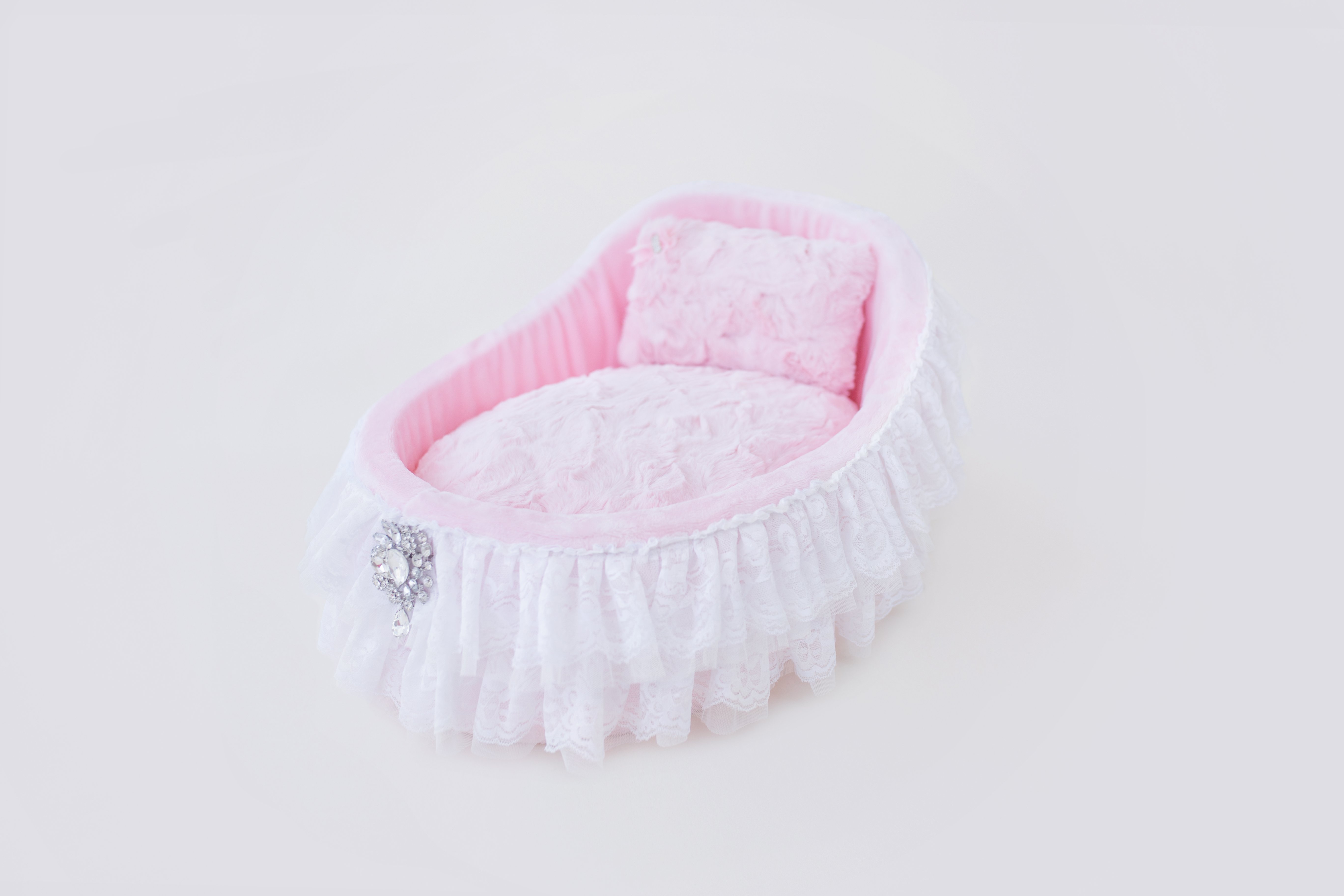 For that beautiful addition to your family, you'll want your pup to have sweet beginnings in our adorable Crib Bed by Hello Doggie, to lull your baby into sweet dreams. Trimmed in two-tiered romantic handmade lace, our cribs also feature a bouquet drop crystal brooch and removable pillow for easy care. Pair with any Hello Doggie Blanket. You'll be the envy of all your friends! Our collection offers four soft colors to choose from. One Size - *20" x 14" x 5 1/2"   |   Pillow inside - 18" x 12"   |   For dogs up to 6 Lbs MSRP - $177.99 *Bed is handmade and sizes may vary slightly. Made in USA.