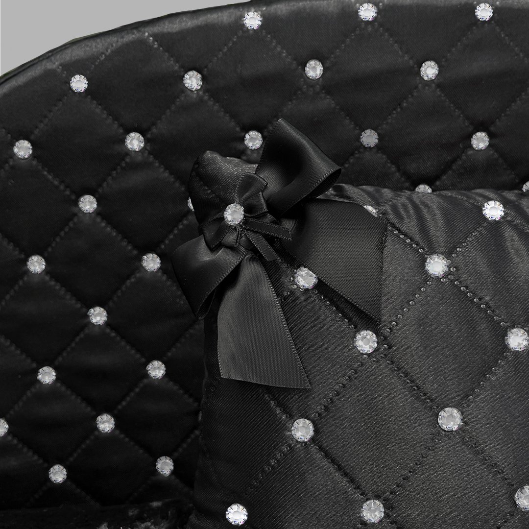 Introducing the Glamour Baby Bed by Hello Doggie, a breathtaking sanctuary for your beloved pet, where luxury meets unparalleled comfort. Inspired by the enchanting allure of the Enchanted Nights Beds, this exquisite bed transforms any space into a stylish haven for your glamorous pooch. Beautifully handcrafted from sumptuous diamond-tufted fabric, the Glamour Baby Bed envelops your pup in a world of sophistication, the plush Bella pillow, filled with plush down-like stuffing, provides a cloud-like resting experience that guarantees sweet dreams after a day filled with play. Adorned with our charming signature satin bow and radiant Swarovski Crystals, each carefully hand placed for a complete look. Designed for stability and peace of mind, the non-slip floor ensures your pet can lounge comfortably without a worry. Elevate your pet’s nap time and add a touch of glamour to your home with the Glamour Baby Bed by Hello Doggie—because your fur baby deserves nothing but the finest! The bed cover features a zipper to remove for easy care, wash mat pillow on delicate cycle in cold water, no bleach or softener and air dry or tumble on low. The cover and crystal pillow is spot clean only, remove brooch beforehand. Matches with Romantic & Bella Blankets, sold separately. Limited Edition One Size - 24" x 19" x 16" | For dogs up to 12lbs MSRP $429.99 *Bed is handmade and sizes may vary slightly. Made in USA.