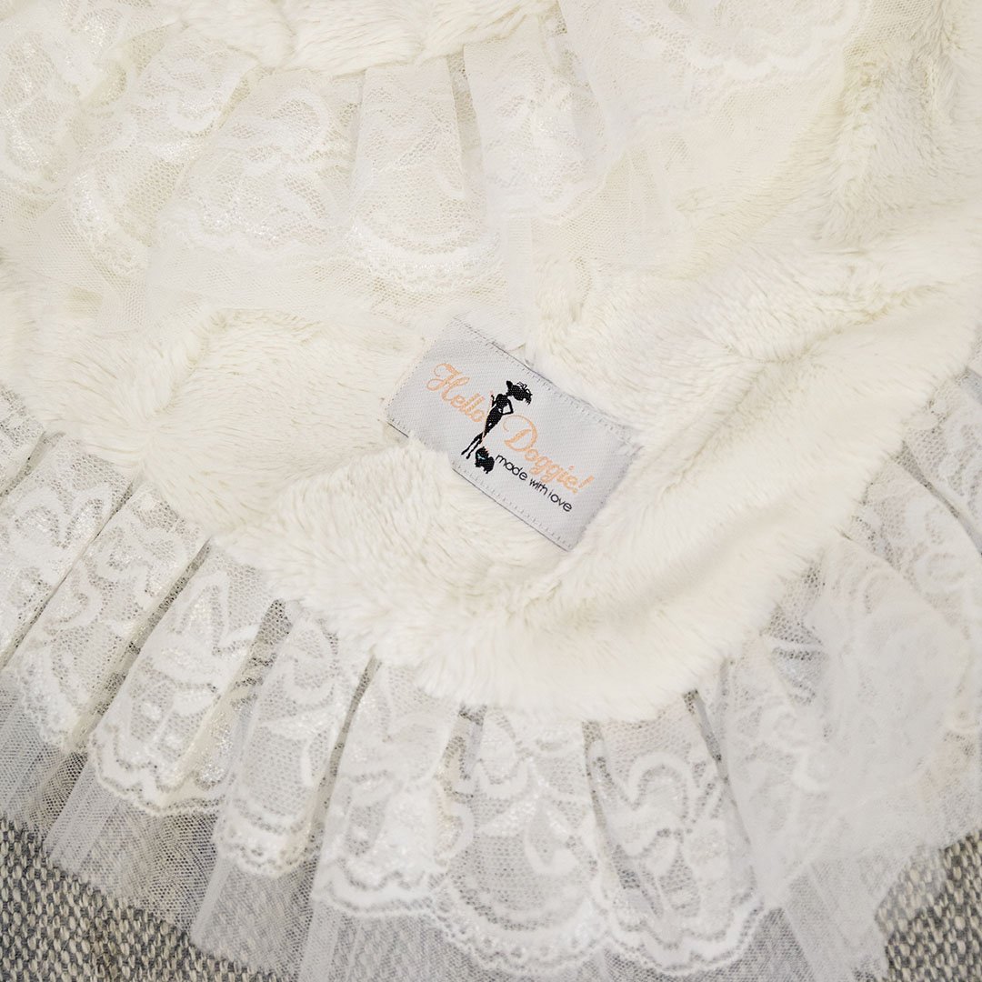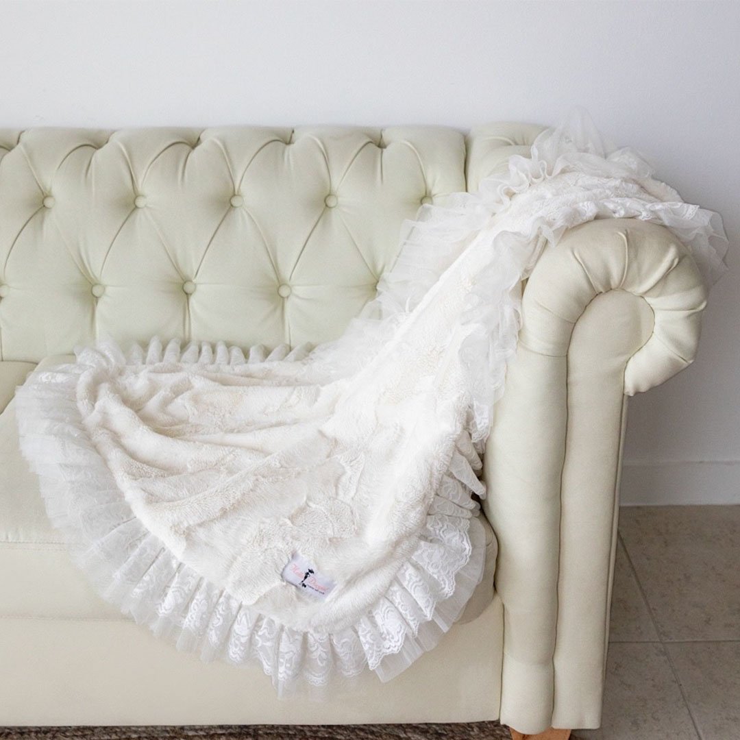This beautiful soft blanket by Hello Doggie is made of high quality soft fabric and features a double layer of 2 tiered romantic lace. It’s so soft your pup won’t leave it. The lace gives the blanket an elegant touch, perfect for home decor. This blanket is easy to care for, spot clean or hand wash and air dry. Add an additional 2" for the satin ruffle for large blanket and add additional 1" for the small. Small Blanket - *17" x 14"     |     For dogs up to 4 Lbs MSRP - $108.00   Large Blanket - *34” x 29"     |    For dogs up to 20 Lbs MSRP - $149.99 Throw Blanket - *58” x 58"     |    For dogs up to 100 Lbs MSRP - $459.99   *Blanket is handmade and sizes may vary slightly. Made in USA.