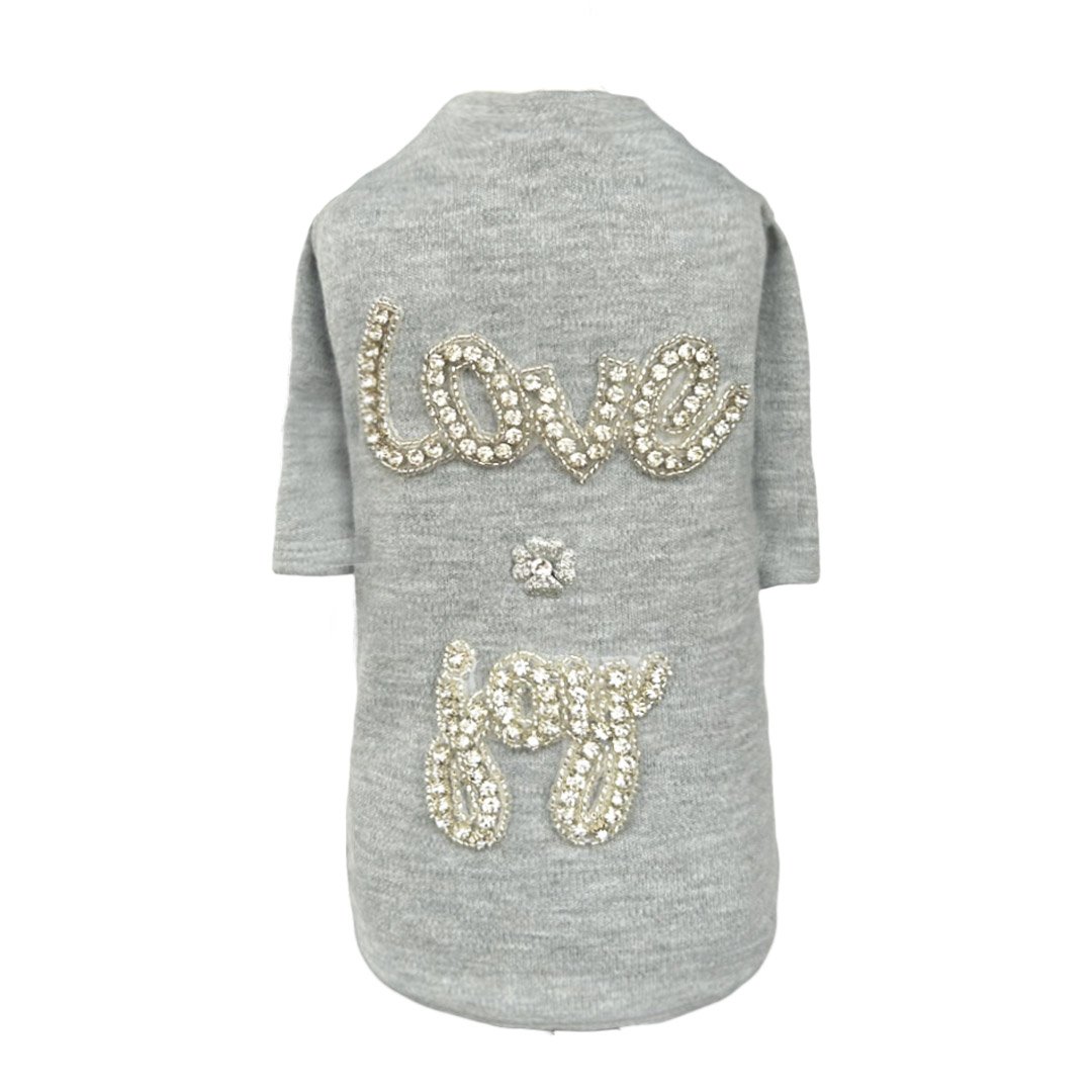 Treat your four-legged companion to the Love and Joy Dog Tee by Hello Doggie, and let them strut their stuff with comfort and style. Made from 100%  cotton Jersey knit textile, this tee provides a soft and breathable , perfect for all-day wear. The love and joy appliqués on the tee add a touch of charm and elegance to your baby’s outfit, featuring a stunning silver flower design embellished with a sparkling Swarovski Crystal, creating a luxurious look. For a brand new look  every time, turn inside out spot clean or wash on delicate, no bleach or softener and air dry. Sizes   |  XS - LG  MSRP  |  $36.00  *Tees are handmade and sizes may vary slightly. Made in USA.