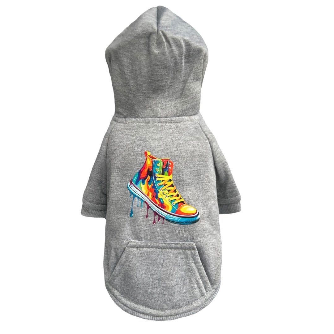 Keep your furry friend cozy and stylish with the Graffiti Pup Dog Hoodie by Hello Doggie. Crafted from premium fleece fabric, this hoodie provides the ultimate warmth and comfort, making it perfect for extra chilly days. Its trendy graffiti-inspired design adds a playful, urban touch to your dog's wardrobe, ensuring they stand out wherever they go. This hoodie is ideal for outdoor adventures or lounging indoors. Soft, durable, and lightweight, it offers all-day comfort, treat your pup to both functionality and fashion with this must-have hoodie! For easy care spot clean or hand wash in cool water. Sizes XXS - LG MSRP  $38.00 *Hoodies are handmade and sizes may vary slightly. Made in USA.